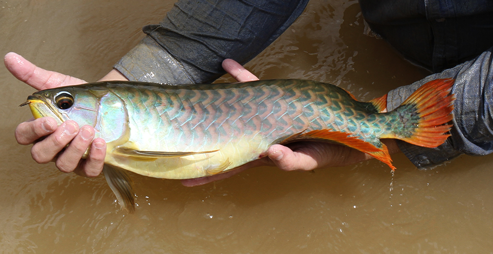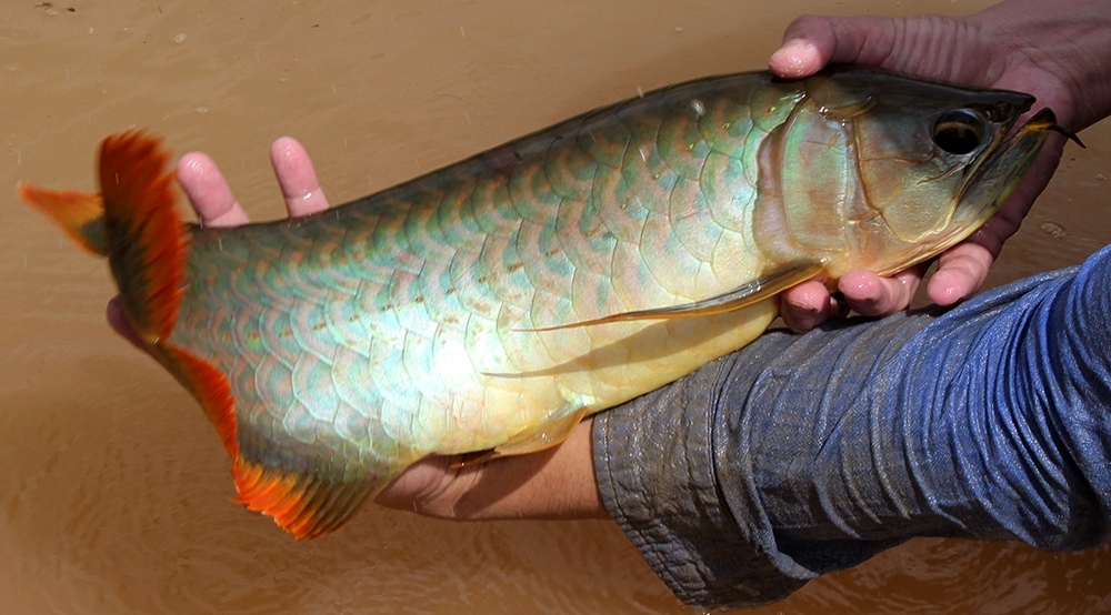 今回、ご紹介したような、”鮮やかなメタリックグリーン・ボディに鮮烈な赤いヒレを持つアロワナ”を、
