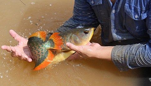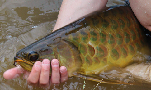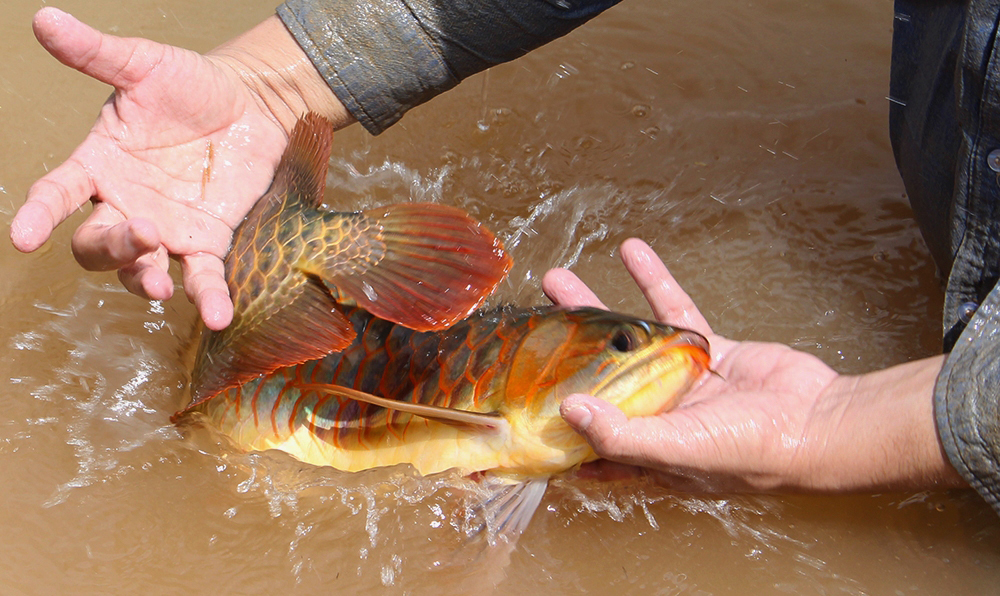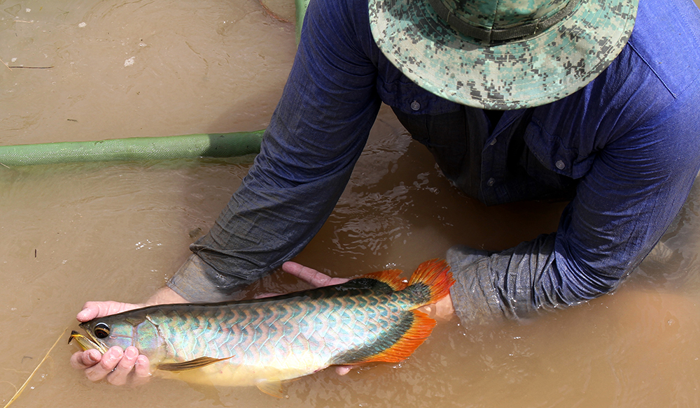 写真上のように、スタッフが網を使って池の端からアロワナを追い込んでいきます。