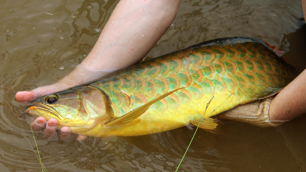 60cm前後の重量級アロワナが、弾丸のように飛んでくる訳ですから、人に激突すると大けがをしかねない、非常に危険な作業でもあります。