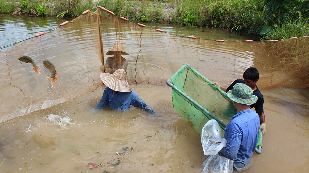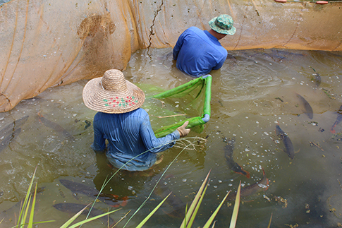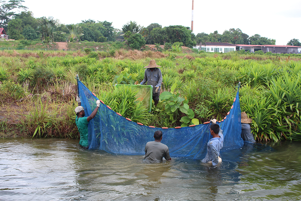 ファームオーナーのニコラス氏、自らが繁殖池に入り、定期的に採仔と種親のクオリティチェックを行っています。