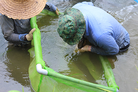 この日はファームスタッフと共に網で種親を追い込み、池上げ作業に立ち会うことができました。