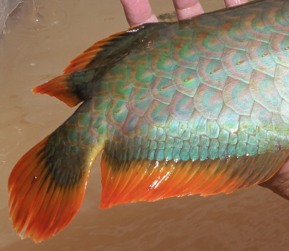 尾びれ付近の拡大画像です。後方三ヒレが鮮やかな緋オレンジ色に染まります。